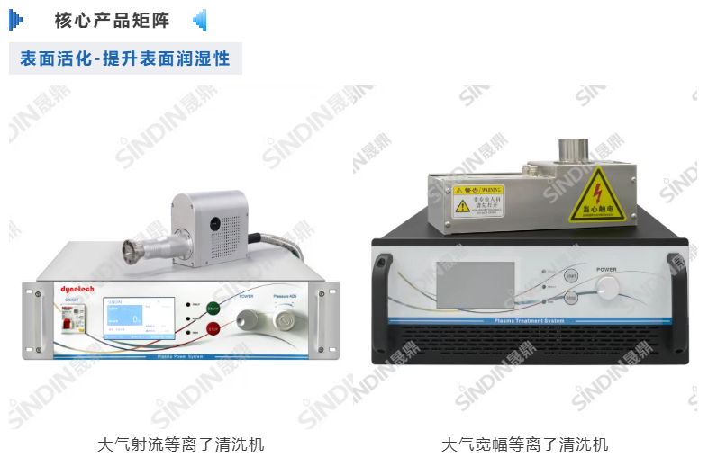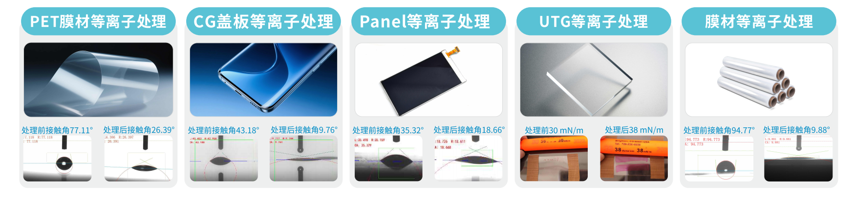 等离子可用于PET膜材PanelUTGCG盖板等材料表面预处理,提高材料表面润湿性,改善界面结合力,从而提升后续贴合、