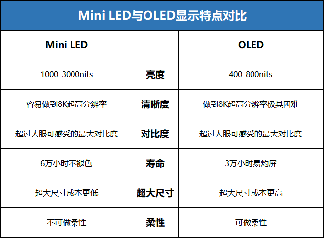 Mini LED性能优于小间距LED,且比OLED更为成熟。